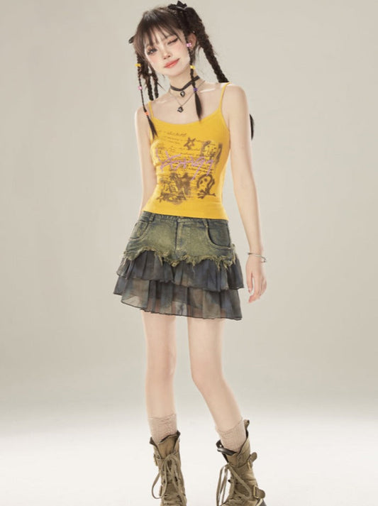 Paint Print Oil French Ruffle Skirt Strap