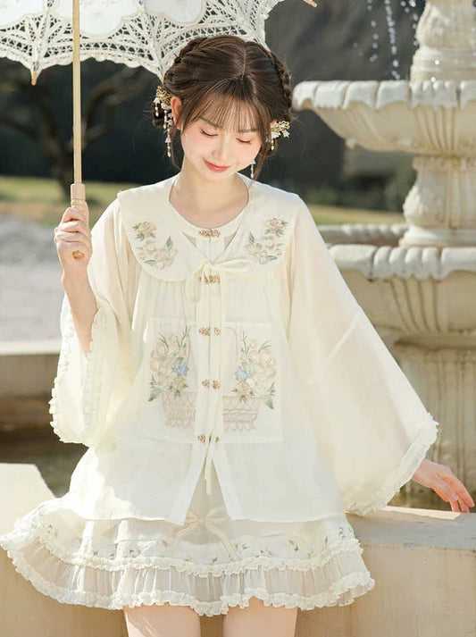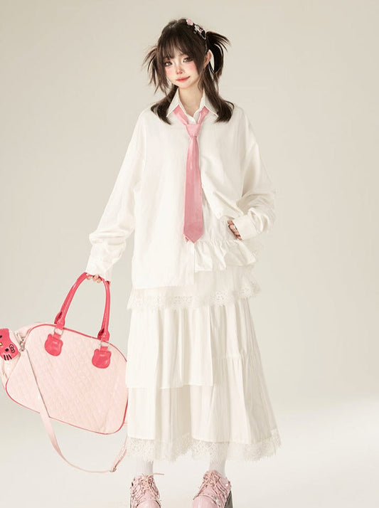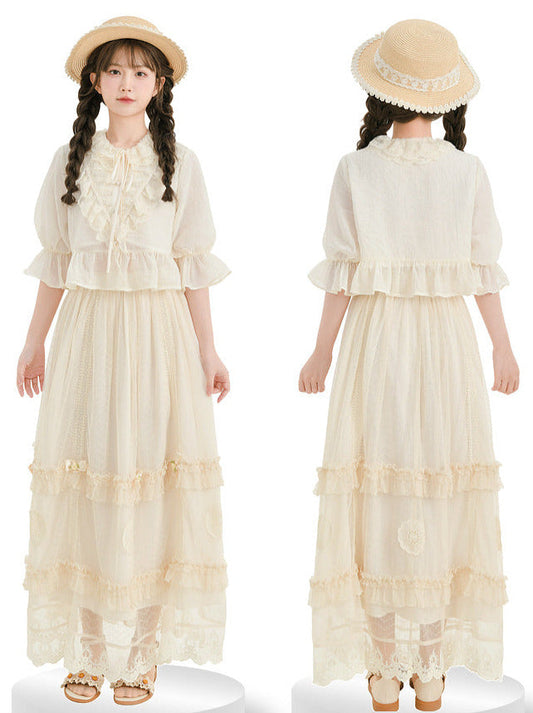 Bell-sleeved Shirt + Shoulder Tulle Bag Skirt Layered Set-up Ribbon Dress Chinese