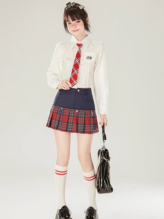 Style Pleated Skirt College Vest Red Brick + Stripe