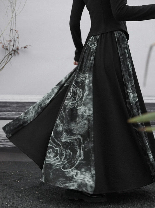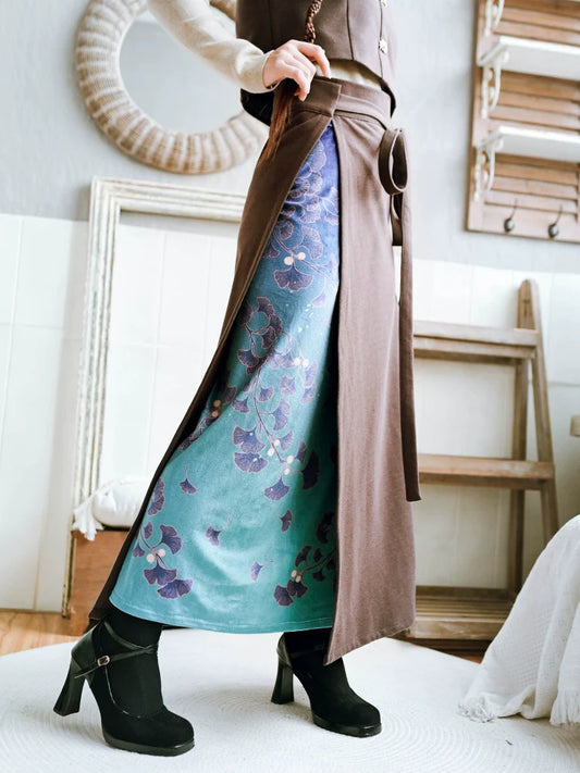 Long China Plus Print Skirt Splicing Velvet