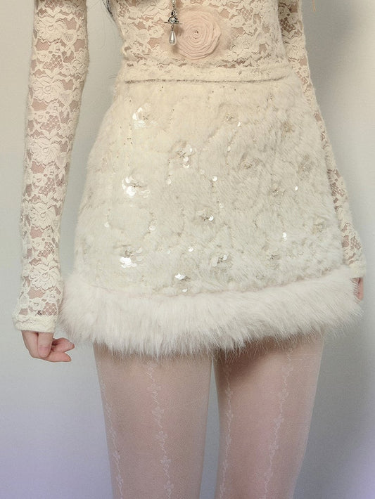 Apricot Sequins Detail Plush Mini Skirt