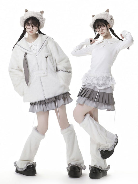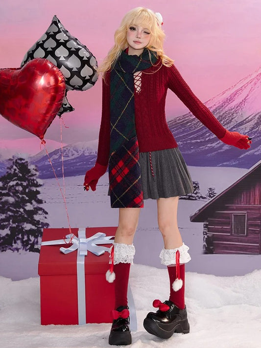 White Long Sleeves Knitted Top Apron Blue Plaid Pattern Skirt Sweet Lolita Full Set