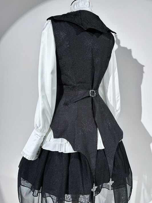 White and Black Gothic Lolita Outfit Shirt + Cross Charms Curved Hem Waistcoat + Spider Web Fabric Skirt Full Set