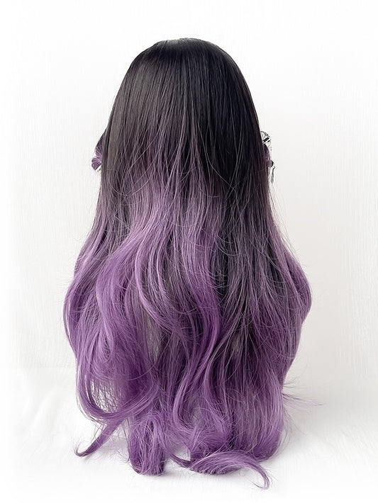 Black-purple Ombre Long Wavy Synthetic Wig With Curtain Bangs