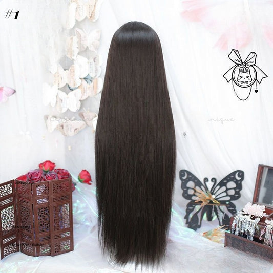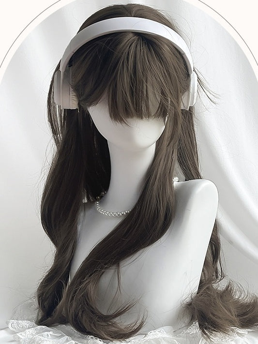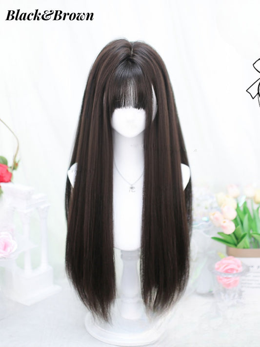 Black Tea 70CM Waist Length Straight Wig With Curtain Bangs