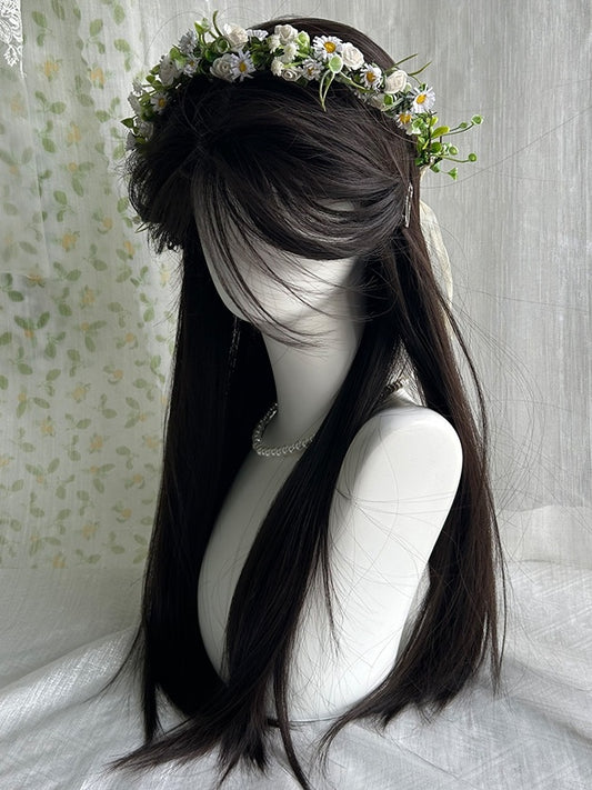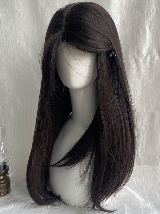 Black Tea Under Bust Length Straight Wig with Curtain Bangs