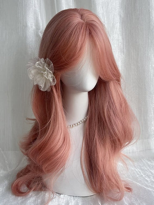 Pink Waist Length Wavy Synthetic Wig With Curtain Bangs