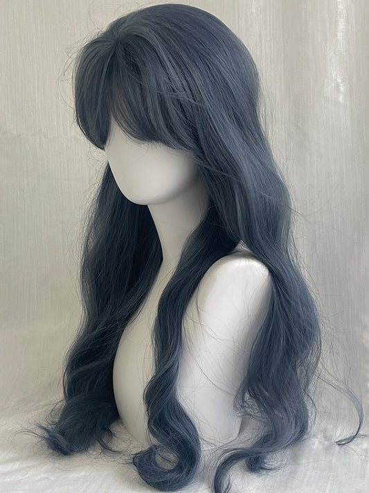 Dusty Blue Waist Length Wavy Wig With Air Bangs