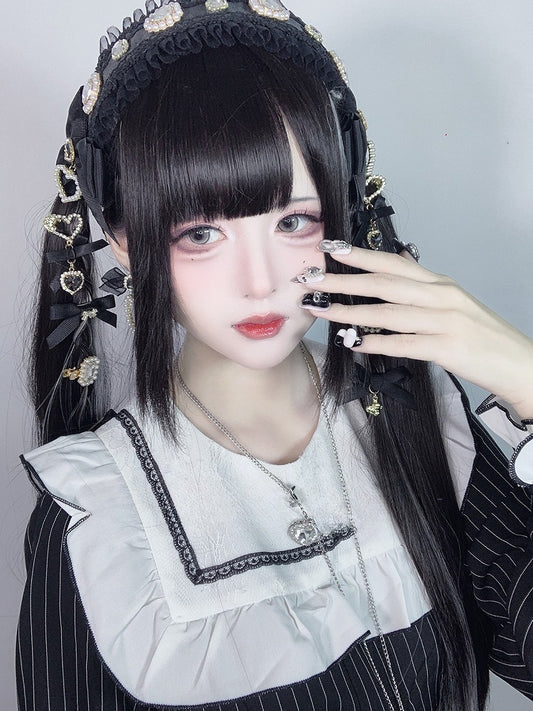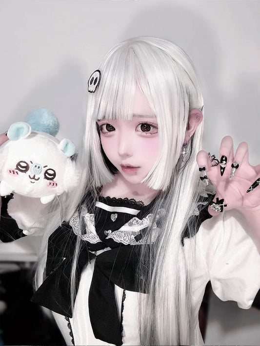 Highlight White Black Length Gothic Straight With And Hime Wig Bangs 80CM Air Cut