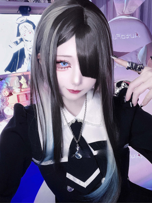 Bangs With Highlight Wig Hime Full Cut Black Straight Length 80CM Silver And