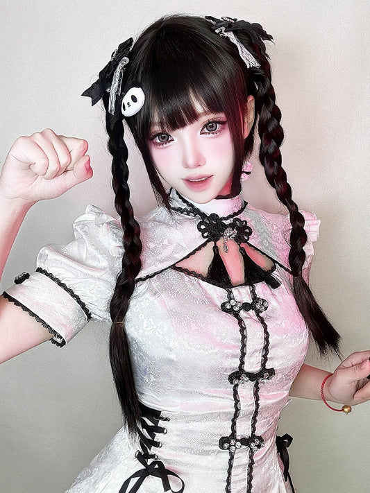 Full Clips 30CM Wig Pink + Short Ponytail With 55CM Bangs Claw Straight Double Braided