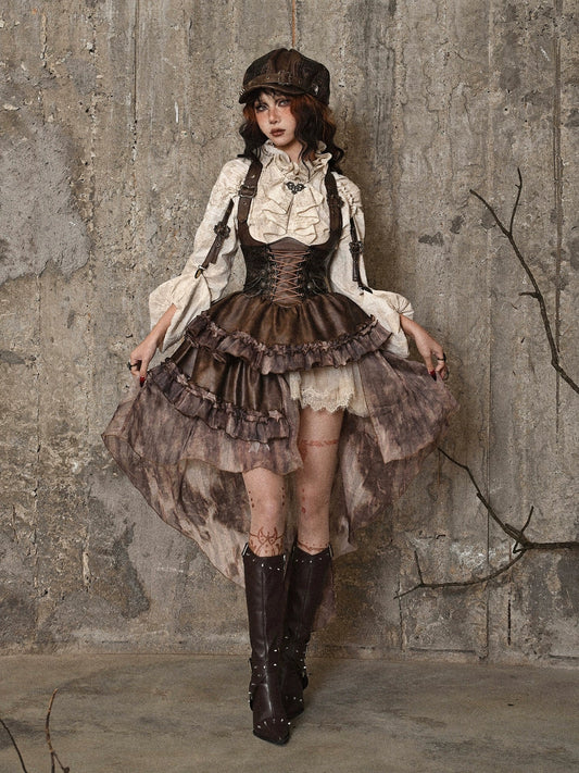 Brown Steampunk Retro Oil Ruffle Trim High-low Skirt