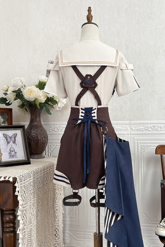 Train Shirt Blue Sailor Overall + Collar Shorts Ouji Steampunk Striped Brown Outfit Lolita -