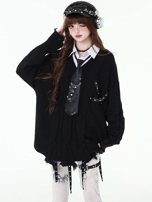 Distress Trim Fake Two-piece Preppy Sweater with Free Tie