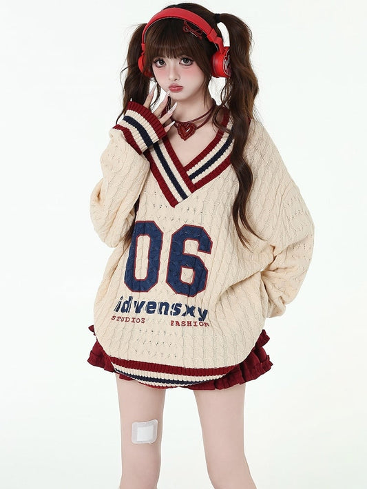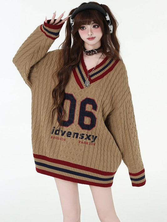 Numbers and Letters Khaki Preppy V-neck Loose Sweater