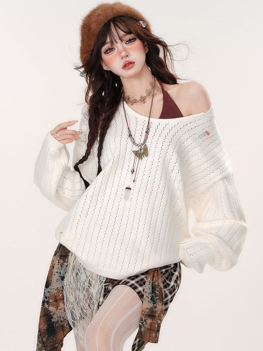 Distressed Holes White Sweater with Coffee Halter Neck Cami Top Set
