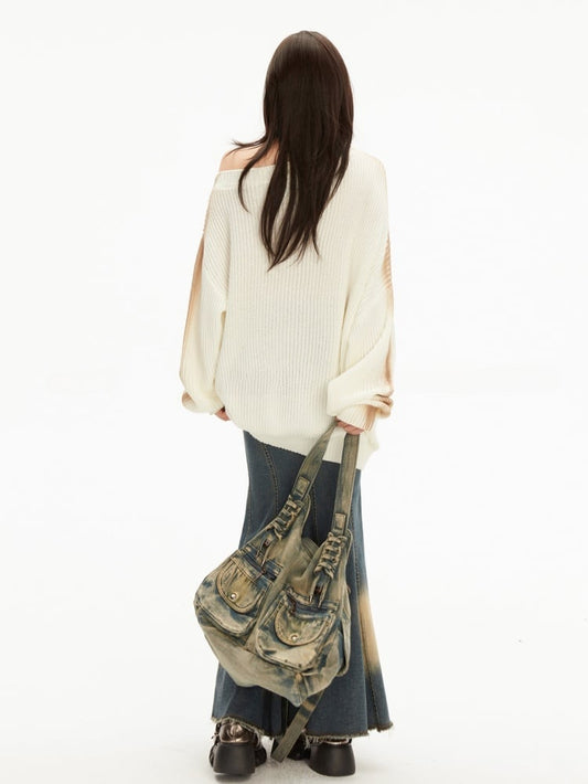 Wasteland Punk Butterfly Applique Apricot Asymmetrical Neckline Sweater