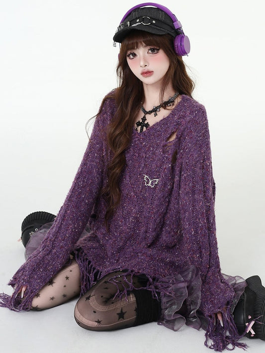 Distressed Holes Fringe Hem Purple Sweater with Free Sacrf