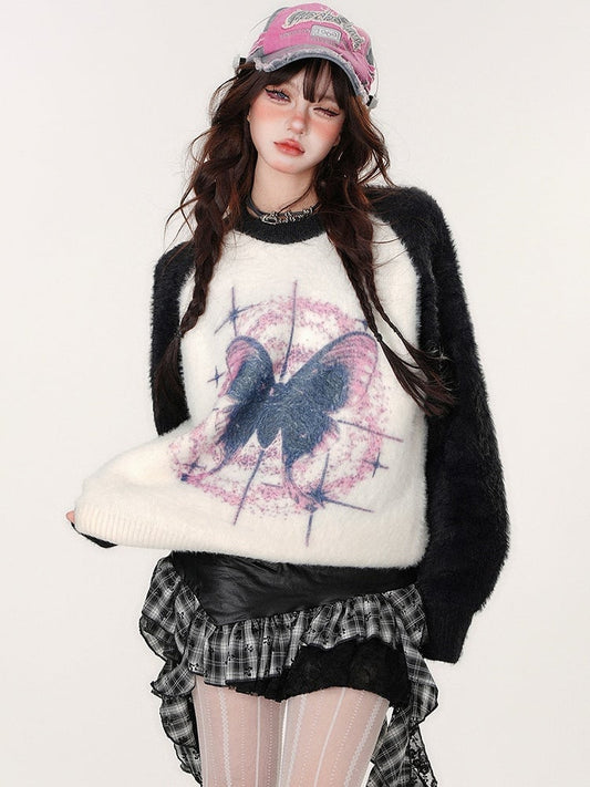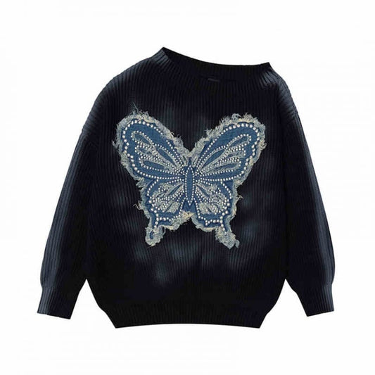 Wasteland Punk Butterfly Applique Black Asymmetrical Neckline Sweater