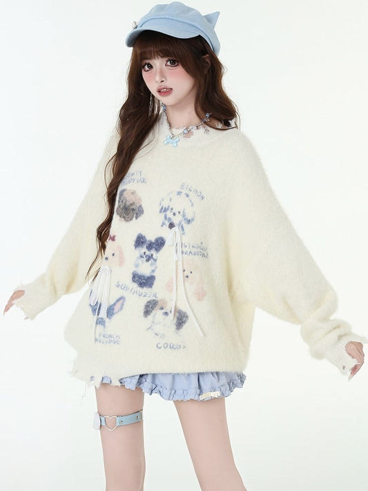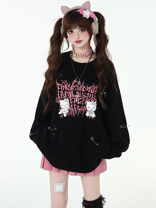Kitties Print Distressed Holes Watermelon Loose Sweater