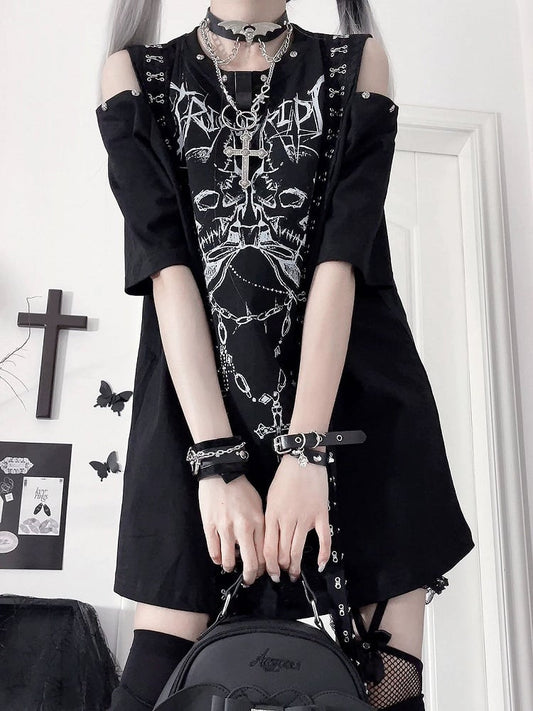 PrintCutout Punk T-shirtwith Emo Cross Black White Design Gothic Shoulder