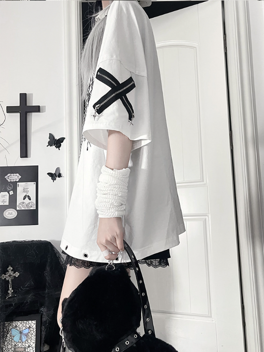 Chain T-Shirtwith Zipper SleeveDetachable Crossed Loose Gothic White