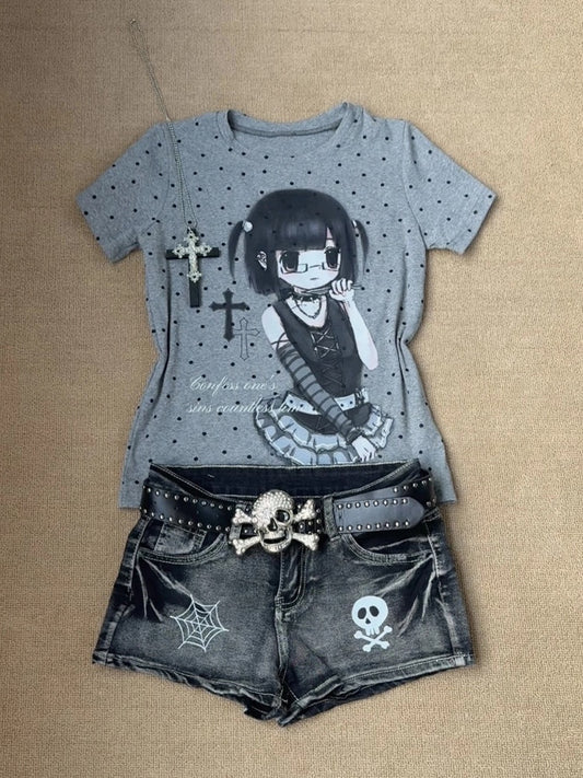 Polka T-Shirt Cartoon / with Print and Gray Cross White Dots