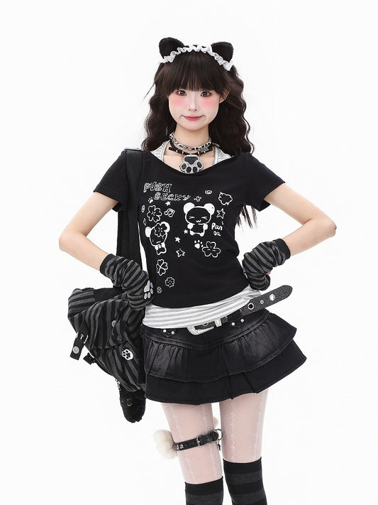 ShoulderAdorable Faux Cutout with Panda Print Black/Green Two-Piece T-shirt