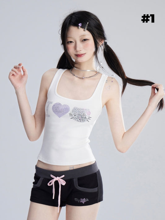 Sweet White Kitty Rhinestones Tank Top/T-Shirt