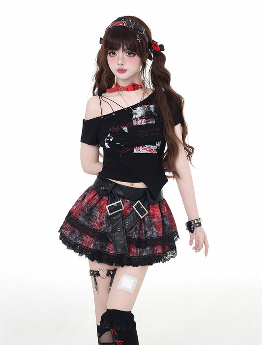 Rock and Hem Red Halter Neck Asymmetrical Neckline Graphic Cropped T-shirt Punk Y2K
