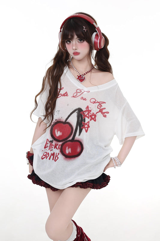 T-Shirt White Semi-Sheer V-Neck Cherry Print Sun Protection Bittersweet