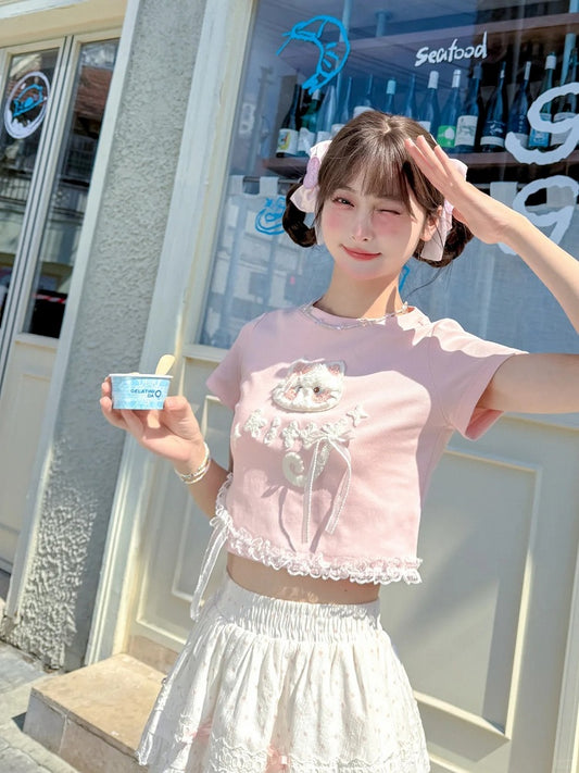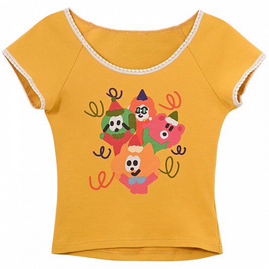 Cartoon Print T-Shirt Neck Ginger Lace Trim Round