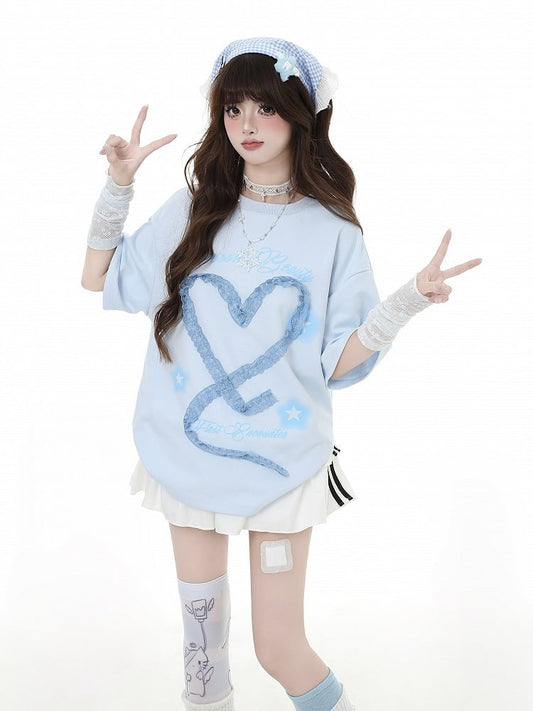 Design Armwear Free Heart-shaped Lace White/Light Blue T-Shirt with