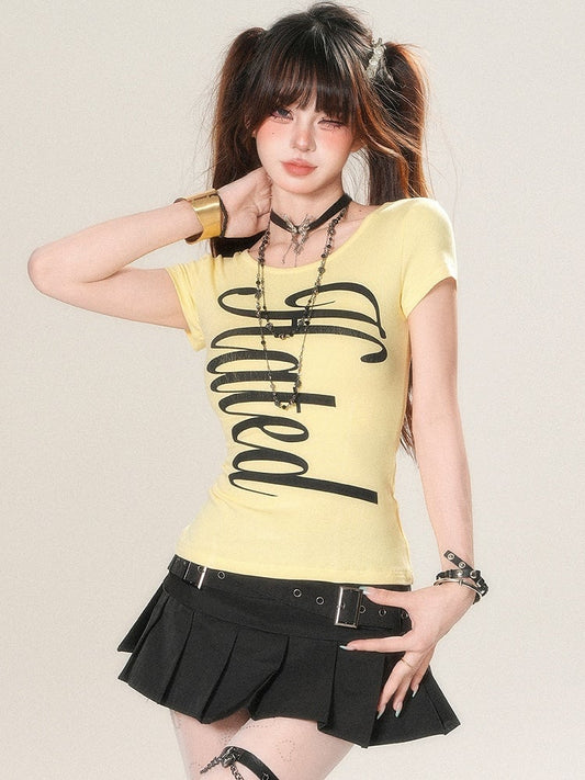 Glamorous Back Design White/Yellow/Black T-shirt Letter Print Criss-cross