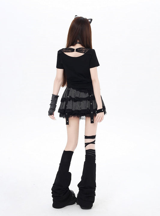 Y2K Black/White Ruffled Lace Trim Neckline T-Shirt Shoulder Cutout Girl Print Cotton