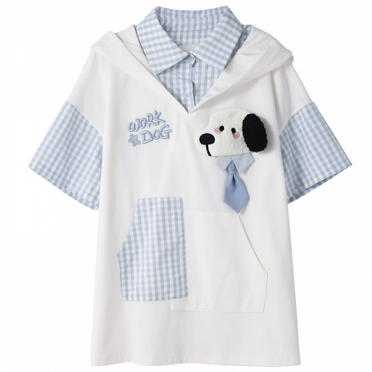 Two-pieces Puppy Ears Design Hood Pattern White and Puppy Faux T-Shirt Blue Plaid