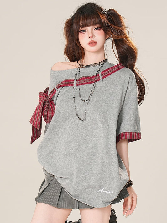 T-shirt Plaid Neckline Pattern Asymmetrical Bowknot Black/Gray