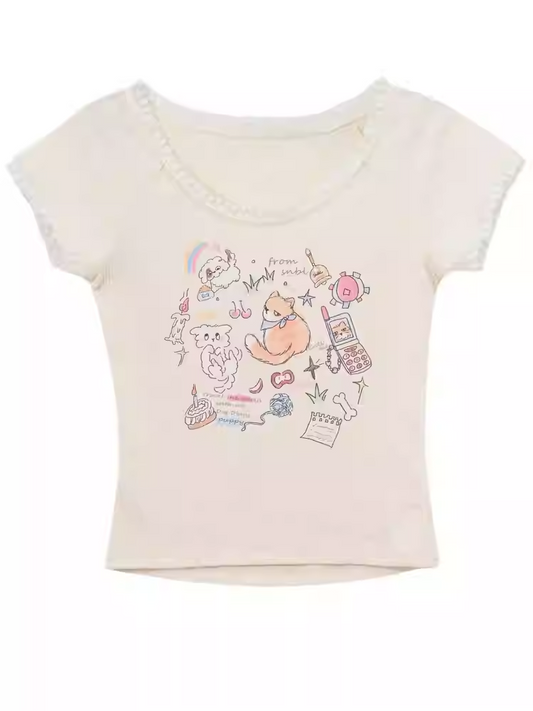 Loose Graffiti T-Shirt Puppy Round Neck Gray/Pink/Light Purple