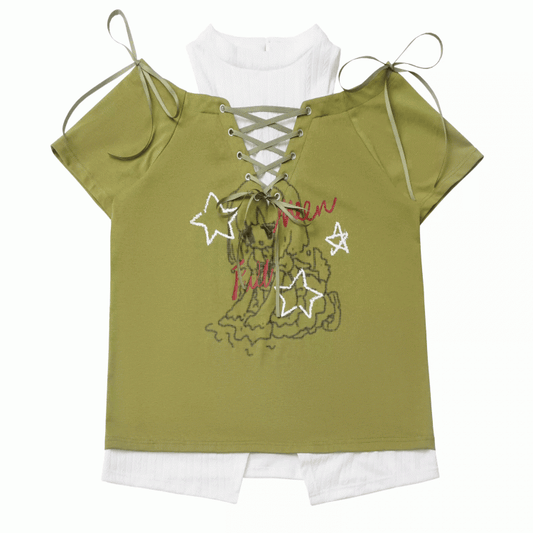 Graphic T-Shirt Neckline Faux Two-pieces Green/Black Cutout Shoulder Lace-up