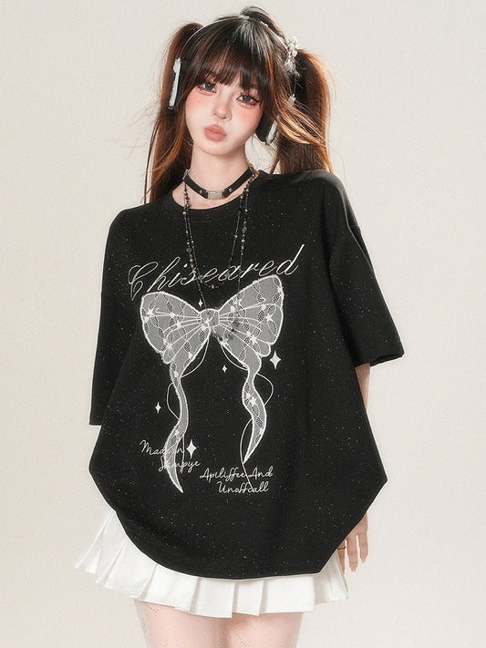 T-Shirt Graphic Black/Grey/White Details Drawstring Waist Lace Trim Bowknot