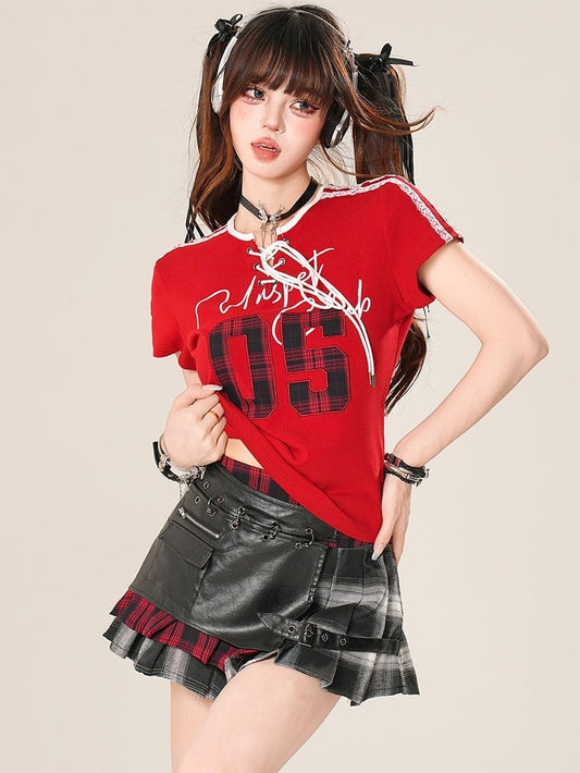 Applique T-shirt Core Plaid Red Detail Lace-up Pattern Trim Blokette Lace Number
