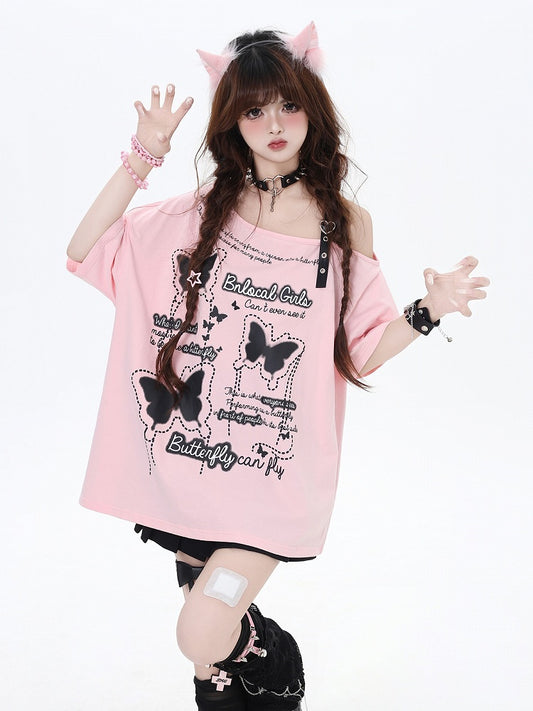 Asymmetrical Neckline Butterfly Print Heart Buckle Black/Pink T-Shirt Loose