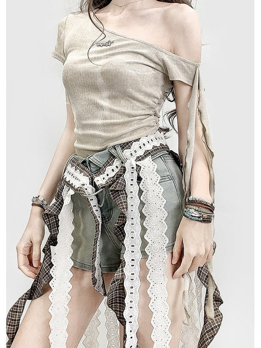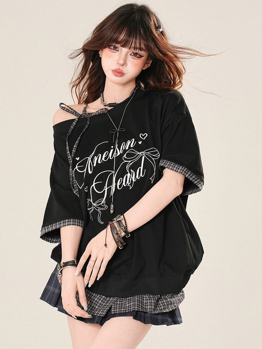 Pattern Strap Bittersweet Self-tie Plaid T-shirt Black Asymmetrical Neckline