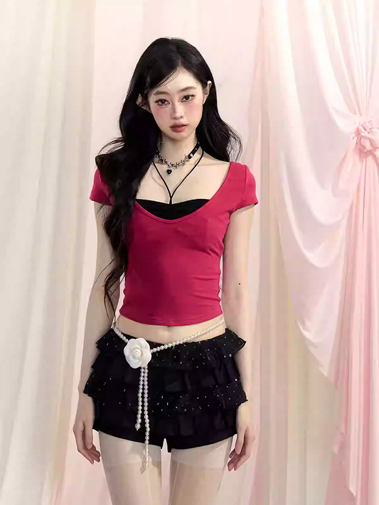 Backless T-Shirt Red/Yellow/Pink Glamorous Faux Two-Piece