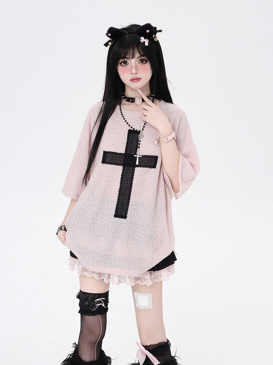 Light T-Shirt Cross Applique Loose Pink/Light Blue/Black