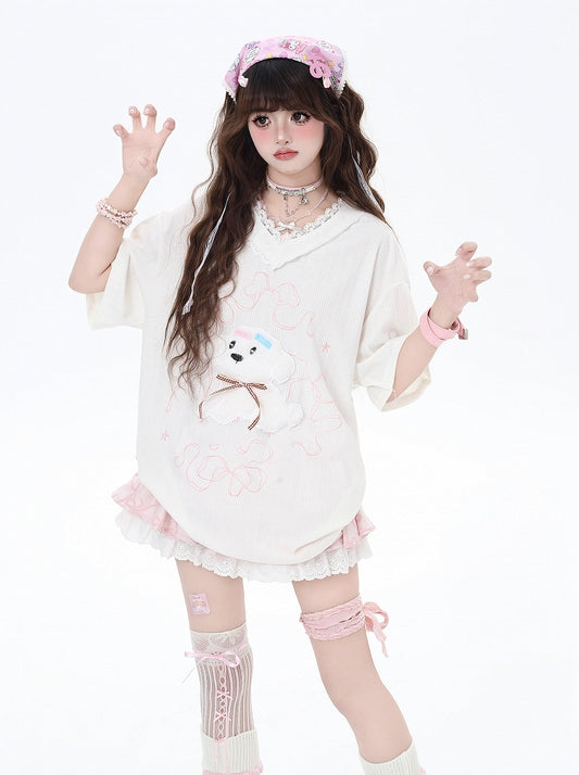 V-Neck Plush Puppy Applique Trim Loose T-Shirt Beige/Light Blue Lace
