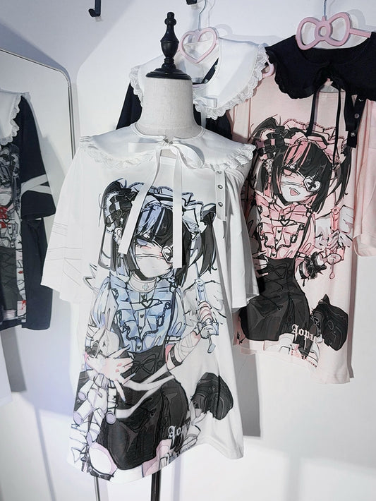 Dark with Cute Pan Anime Kawaii Detachable Yami Collar Print / Peter T-shirt: Cotton White Pink