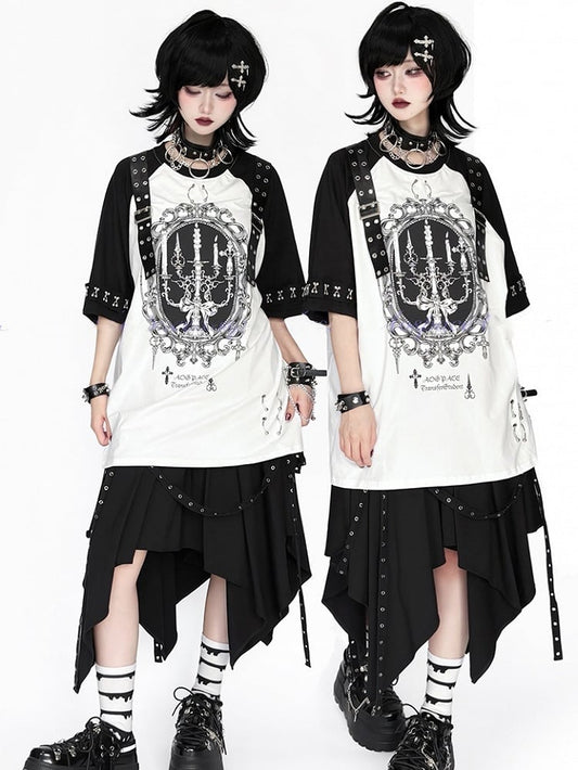 Shoulder Punk on Buckle Frame Print Picture with Cuffs Candelabra Rock Black White T-Shirt and - Details