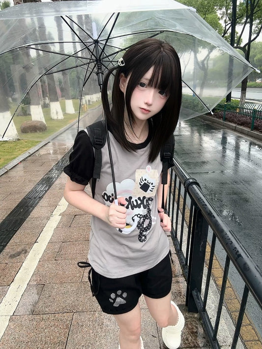 Jirai T-shirt Neckline Kei Kawaii Print Off-the-shoulder White Yami Cartoon