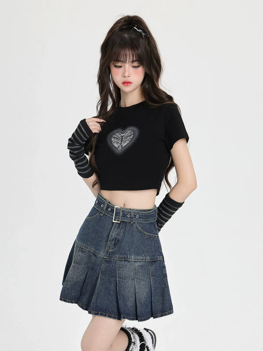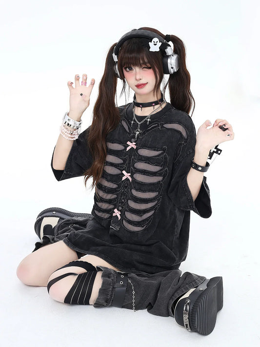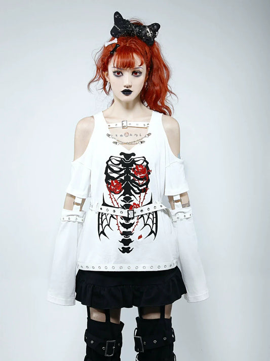 Dark Riveted Lace T-Shirt Love Loose Open Shelder